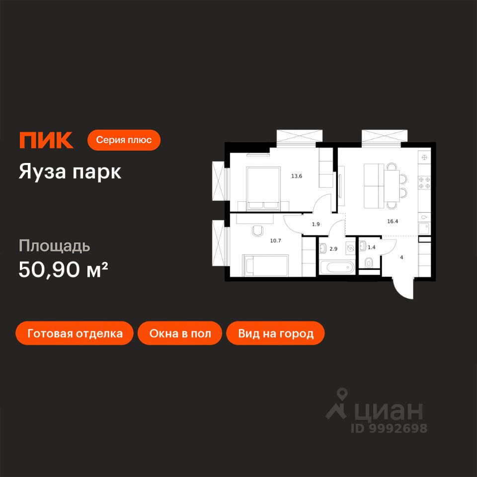 Продаётся 2-комн. квартира площадью 50,9 кв.м на 21 этаже 25 этажного дома (Корпус 9, Секция 1) проекта ПИК Яуза парк. Светлый просторный подъезд на уровне земли, функциональная планировка, большие окна, c отделкой.