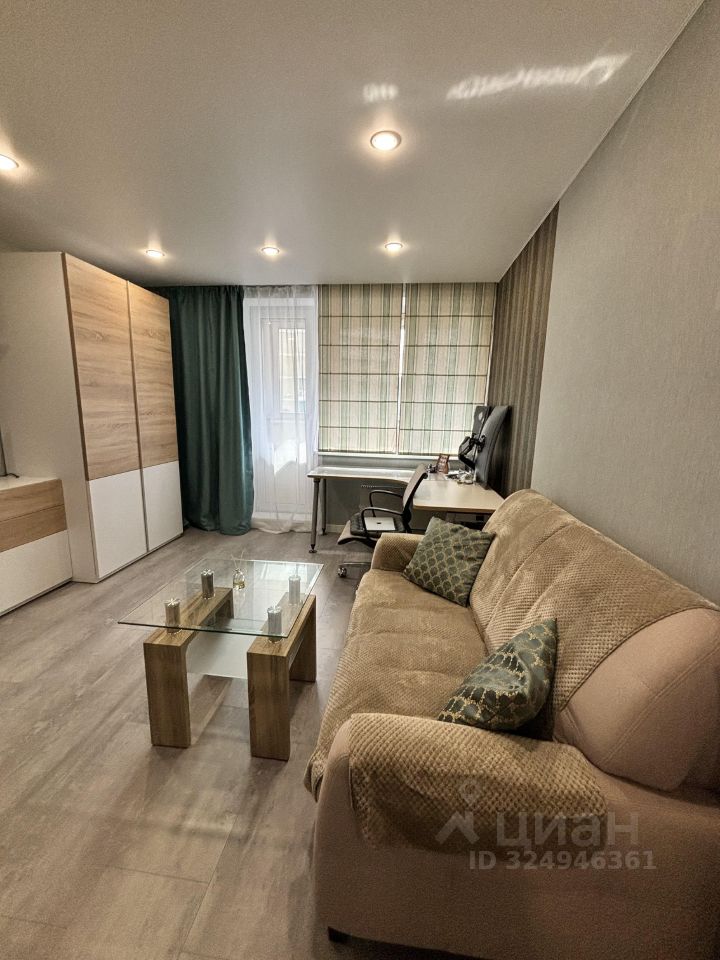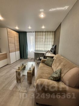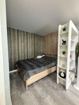 Большая утеплённая лоджия, окна во двор. В комнате грамотно зонировано пространство: есть и уединенная спальня зона и светлая гостиная с диваном и большим рабочим столом у окна.