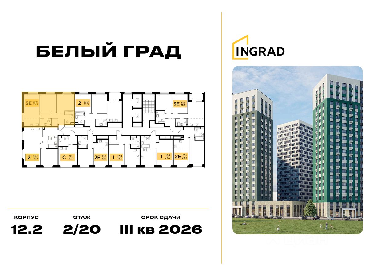 Пряма продажа от застройщика. В жилом квартале комфорт-класса "Белый Град" (застройщик ГК Инград) продаётся 2-спальная квартира площадью 60.50 кв.м без отделки. Квартира расположена на 10 этаже 20-этажного дома, корпус 12.2.