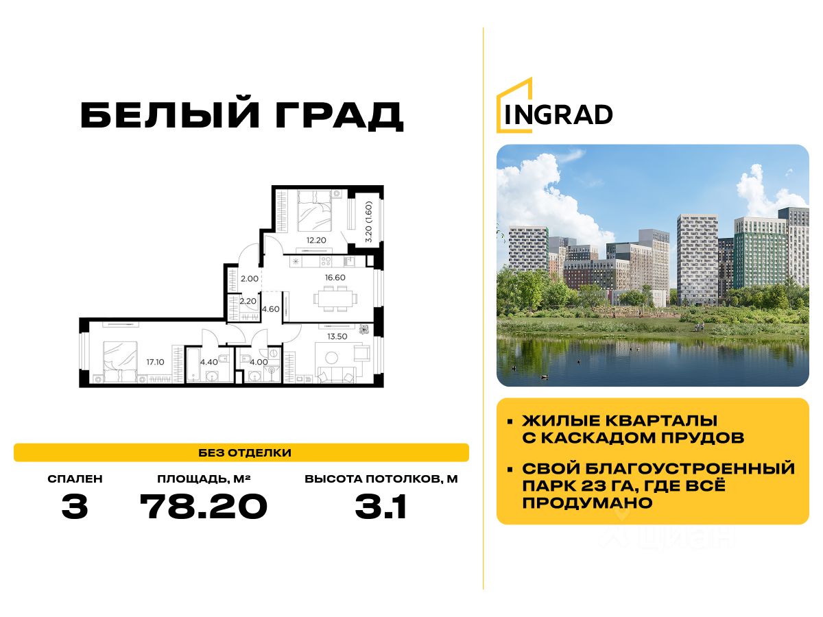 Пряма продажа от застройщика. В жилом квартале комфорт-класса "Белый Град" (застройщик ГК Инград) продаётся 3-спальная квартира площадью 78.20 кв.м без отделки. Квартира расположена на 23 этаже 23-этажного дома, корпус 11.1.