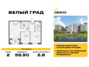 Пряма продажа от застройщика. В жилом квартале комфорт-класса "Белый Град" (застройщик ГК Инград) продаётся 2-спальная квартира площадью 59.90 кв.м без отделки. Квартира расположена на 4 этаже 12-этажного дома, корпус 11.2.