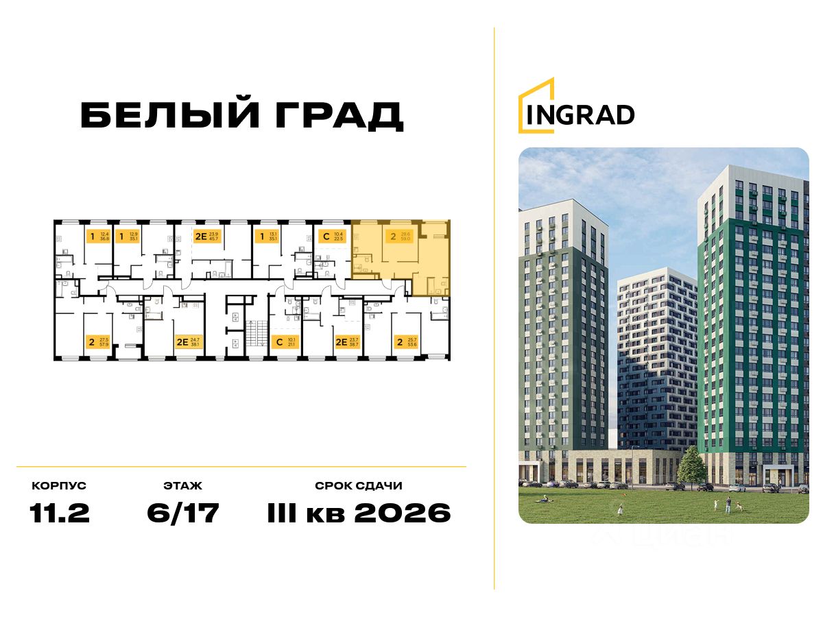 Пряма продажа от застройщика. В жилом квартале комфорт-класса "Белый Град" (застройщик ГК Инград) продаётся 2-спальная квартира площадью 59.00 кв.м без отделки. Квартира расположена на 9 этаже 17-этажного дома, корпус 11.2.