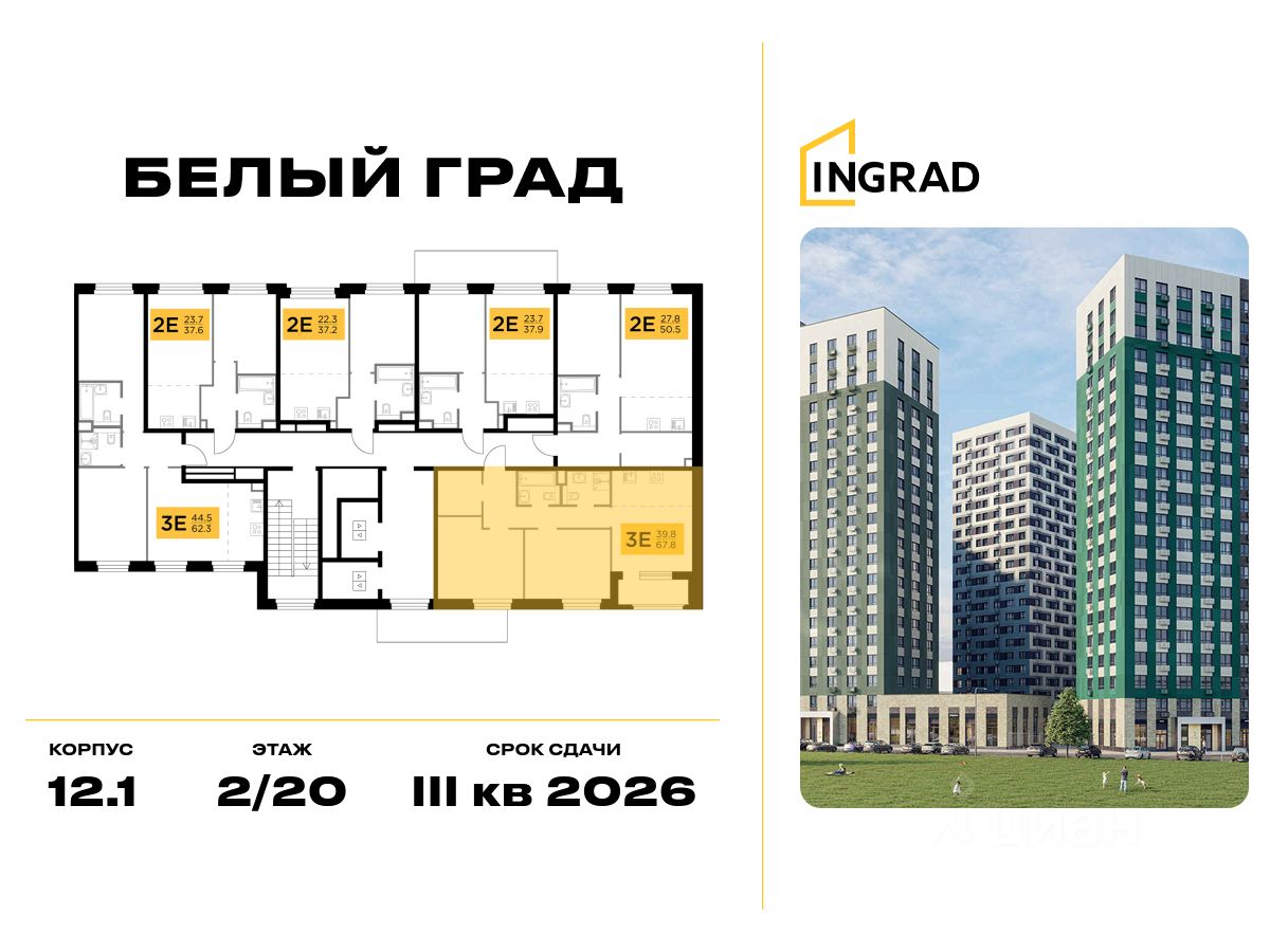 Пряма продажа от застройщика. В жилом квартале комфорт-класса "Белый Град" (застройщик ГК Инград) продаётся 2-спальная квартира площадью 67.80 кв.м без отделки. Квартира расположена на 2 этаже 20-этажного дома, корпус 12.1.