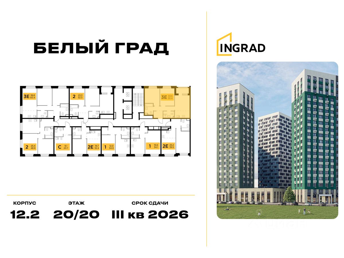 Пряма продажа от застройщика. В жилом квартале комфорт-класса "Белый Град" (застройщик ГК Инград) продаётся 2-спальная квартира площадью 55.40 кв.м без отделки. Квартира расположена на 20 этаже 20-этажного дома, корпус 12.2.