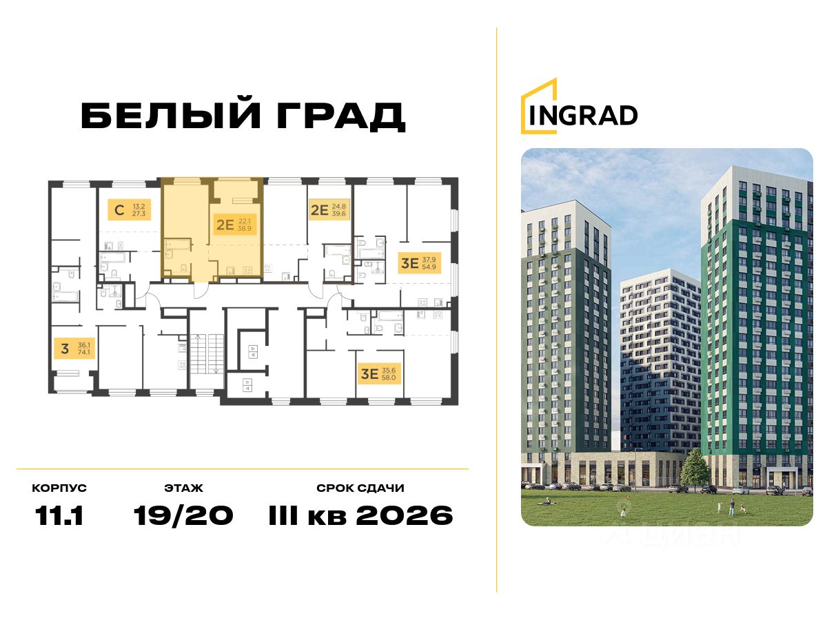Пряма продажа от застройщика. В жилом квартале комфорт-класса "Белый Град" (застройщик ГК Инград) продаётся 1-спальная квартира площадью 38.90 кв.м без отделки. Квартира расположена на 20 этаже 20-этажного дома, корпус 11.1.