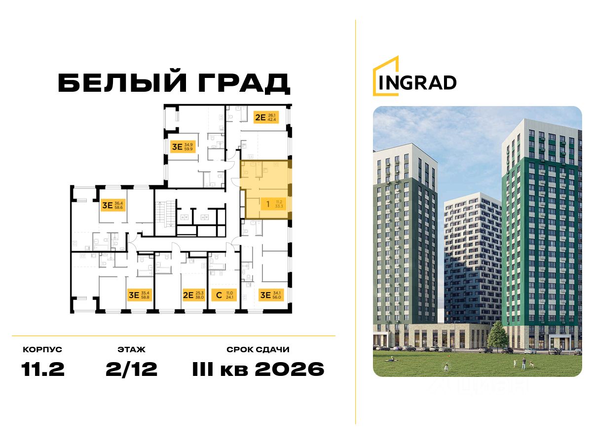 Пряма продажа от застройщика. В жилом квартале комфорт-класса "Белый Град" (застройщик ГК Инград) продаётся 1-спальная квартира площадью 33.30 кв.м без отделки. Квартира расположена на 2 этаже 12-этажного дома, корпус 11.2.