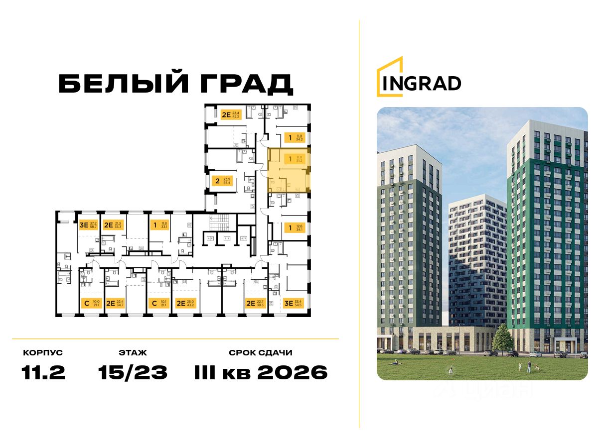 Пряма продажа от застройщика. В жилом квартале комфорт-класса "Белый Град" (застройщик ГК Инград) продаётся 1-спальная квартира площадью 31.20 кв.м без отделки. Квартира расположена на 13 этаже 23-этажного дома, корпус 11.2.