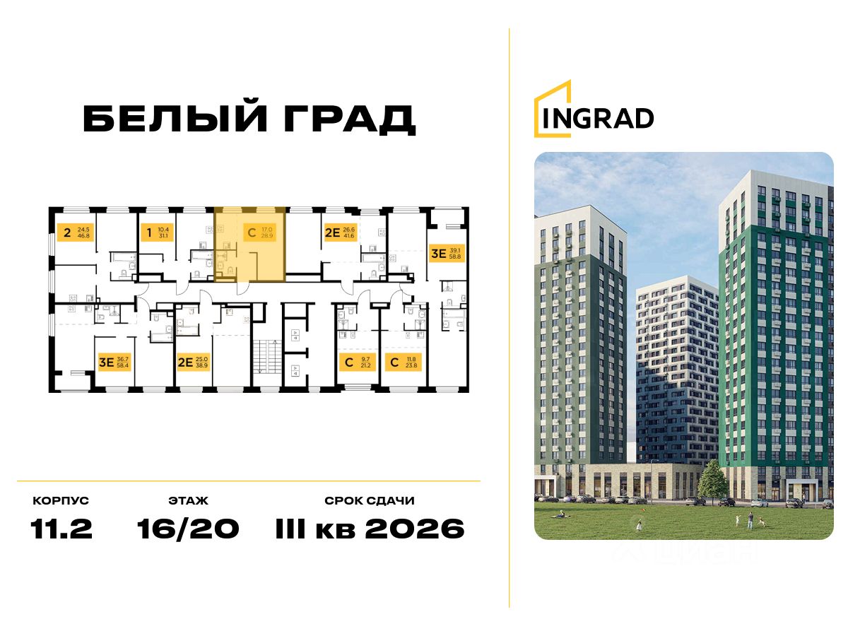 Пряма продажа от застройщика. В жилом квартале комфорт-класса "Белый Град" (застройщик ГК Инград) продаётся 1-спальная квартира площадью 28.90 кв.м без отделки. Квартира расположена на 16 этаже 20-этажного дома, корпус 11.2.