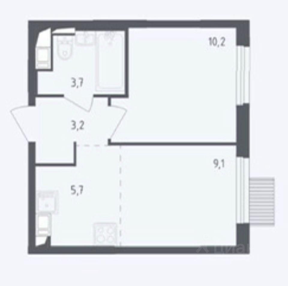 Большая кухня-гостиная - 15 кв. м и спальня - 10,5 кв.м. Квартира без балкона. Сан узел совмещенный - 4 кв.м. Коридор 3,5 кв.м, есть ниша под шкаф-купе или прихожую.