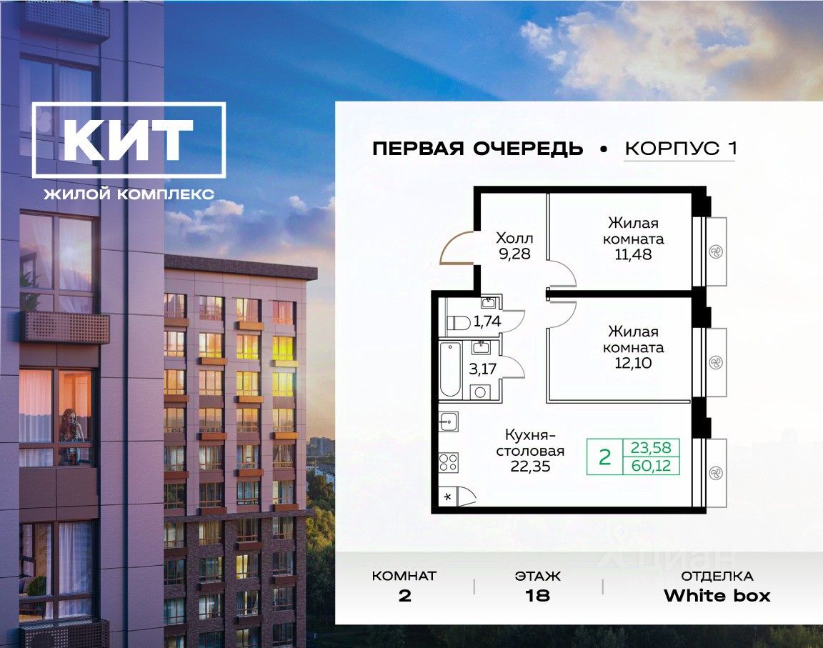 Продаётся 2-к квартира 60.2 кв.м. с чистовой отделкой в ЖК "КИТ" на 18-м этаже 25 этажного дома.