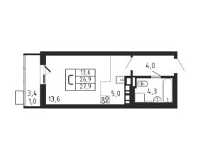 Продаётся студия в строящемся доме (Корпус 4), срок сдачи: II-кв. 2026, общей площадью 27.9 кв.м., на 9 этаже.