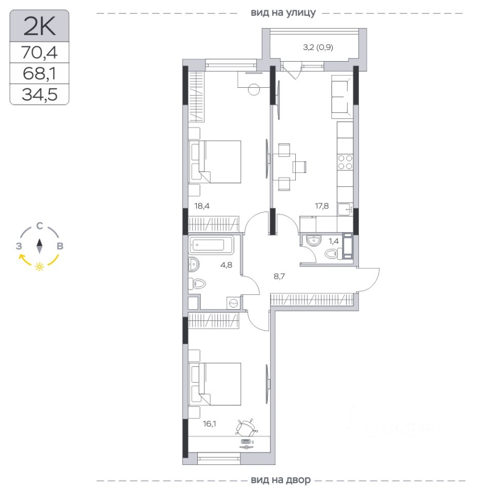 Продаётся 2-комнатная квартира в сданном доме (Корпус 15), срок сдачи: III-кв. 2024, общей площадью 68.2 кв.м., на 7 этаже.