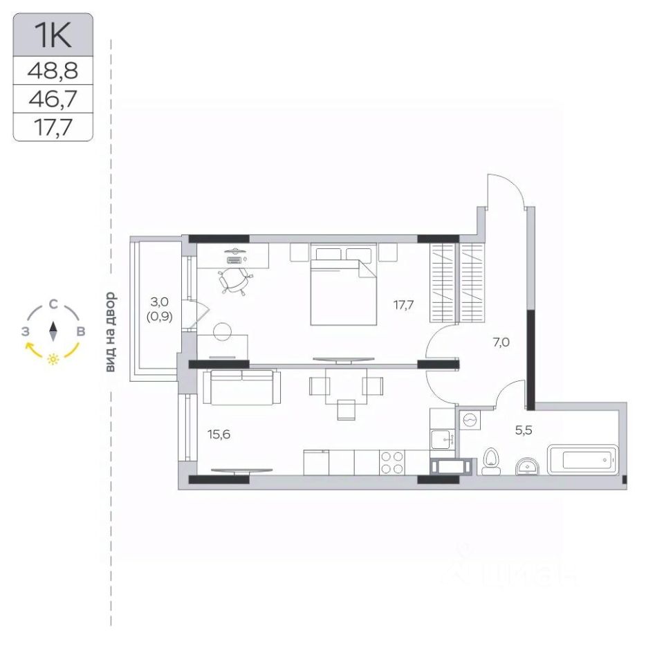 Продаётся 1-комнатная квартира в сданном доме (Корпус 15), срок сдачи: III-кв. 2024, общей площадью 46.7 кв.м., на 5 этаже.
