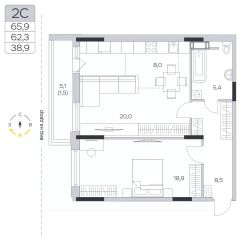 Продаётся 2-комнатная квартира в сданном доме (Корпус 15), срок сдачи: III-кв. 2024, общей площадью 62.2 кв.м., на 9 этаже.