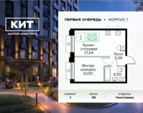 Продаётся 1-к квартира 36 кв.м. с чистовой отделкой в ЖК "КИТ" на 16-м этаже 25 этажного дома.