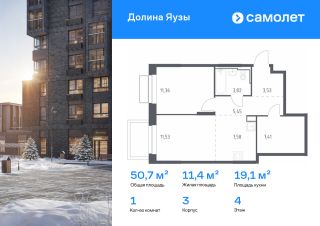 Строим кварталы для жизни с заботой о будущем. Предлагается 1-комнатная квартира комфорт-класса 50,68 кв.м в корпусе 3 на 4 этаже, в ЖК "Долина Яузы"