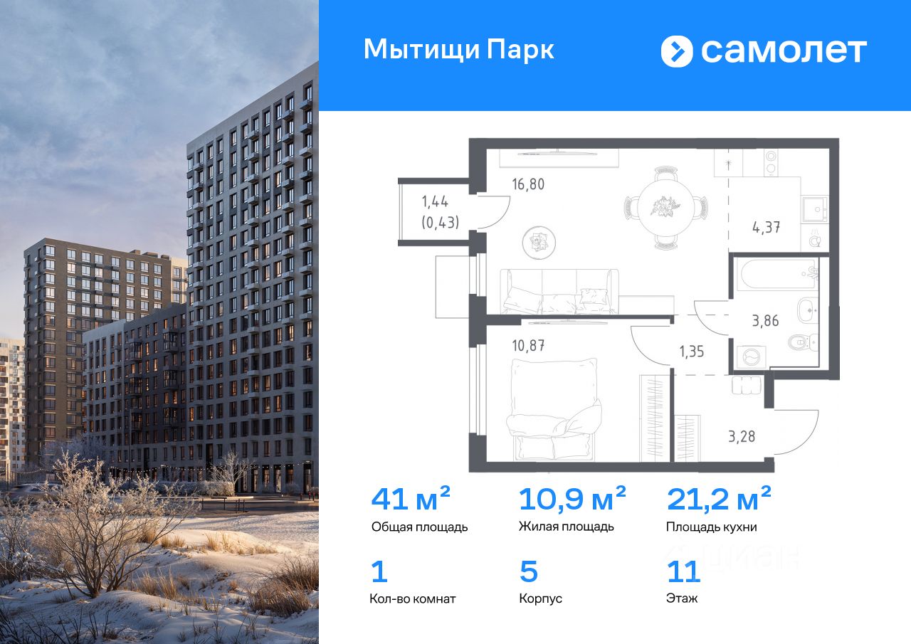 Строим кварталы для жизни с заботой о будущем. Предлагается 1-комнатная квартира комфорт-класса 40,96 кв.м в корпусе 5 на 11 этаже, в ЖК "Мытищи Парк"