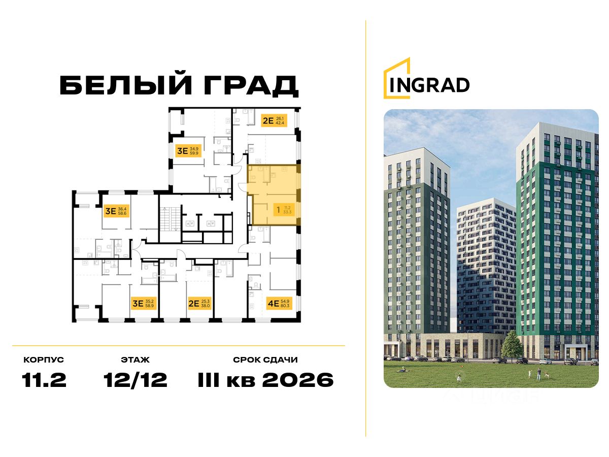 Пряма продажа от застройщика. В жилом квартале комфорт-класса "Белый Град" (застройщик ГК Инград) продаётся 1-спальная квартира площадью 33.30 кв.м без отделки. Квартира расположена на 12 этаже 12-этажного дома, корпус 11.2.