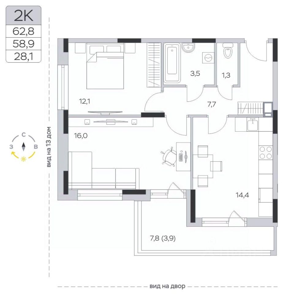 Продаётся 2-комнатная квартира в сданном доме (Корпус 15), срок сдачи: III-кв. 2024, общей площадью 58.9 кв.м., на 9 этаже.