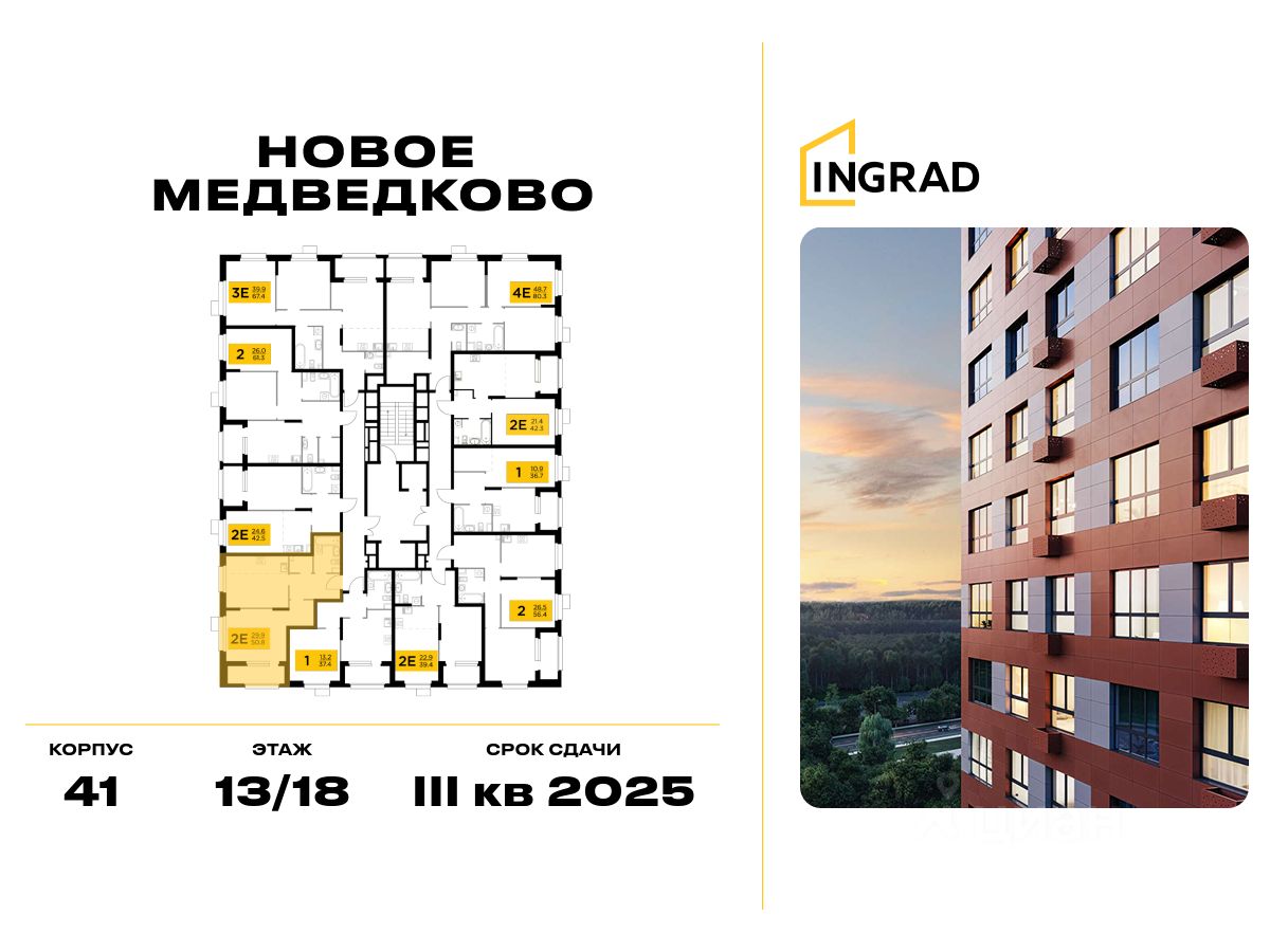 Прямая продажа от застройщика. В жилом квартале, расположенном в северо-западной части города Мытищи, продаётся 1-спальная квартира площадью 48.50 кв.м без отделки. Квартира расположена на 13 этаже 18-этажного дома, корпус 41, в жилом квартале комфорт-класса Новое Медведково (застройщик ГК Инград).