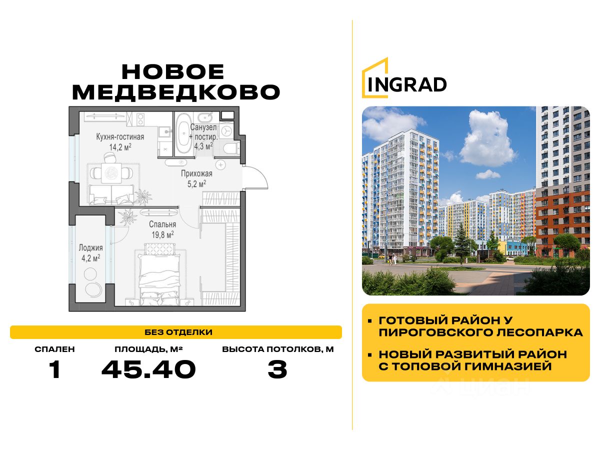 Прямая продажа от застройщика. В жилом квартале, расположенном в северо-западной части города Мытищи, продаётся 1-спальная квартира площадью 45.40 кв.м без отделки. Квартира расположена на 17 этаже 17-этажного дома, корпус 39, в жилом квартале комфорт-класса Новое Медведково (застройщик ГК Инград).