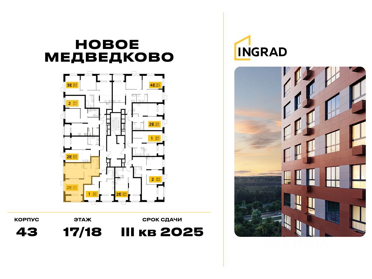 Прямая продажа от девелопера. В жилом квартале, расположенном в северо-западной части города Мытищи, продаётся 1-спальная квартира площадью 48.70 кв.м без отделки. Квартира расположена на 17 этаже 18-этажного дома, корпус 43, в жилом квартале комфорт-класса "Новое Медведково" (девелопер Ingrad).