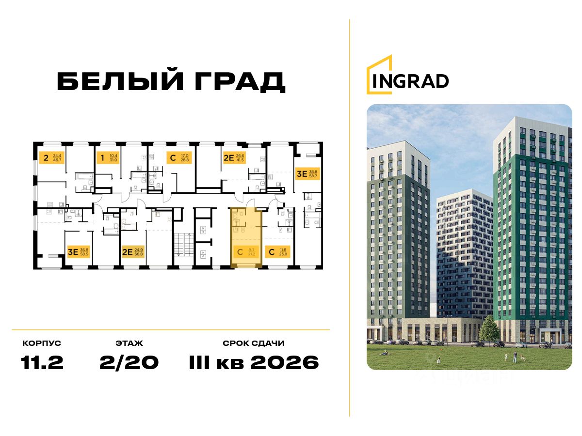 Пряма продажа от застройщика. В жилом квартале комфорт-класса "Белый Град" (застройщик ГК Инград) продаётся студия площадью 21.20 кв.м без отделки. Квартира расположена на 2 этаже 20-этажного дома, корпус 11.2.