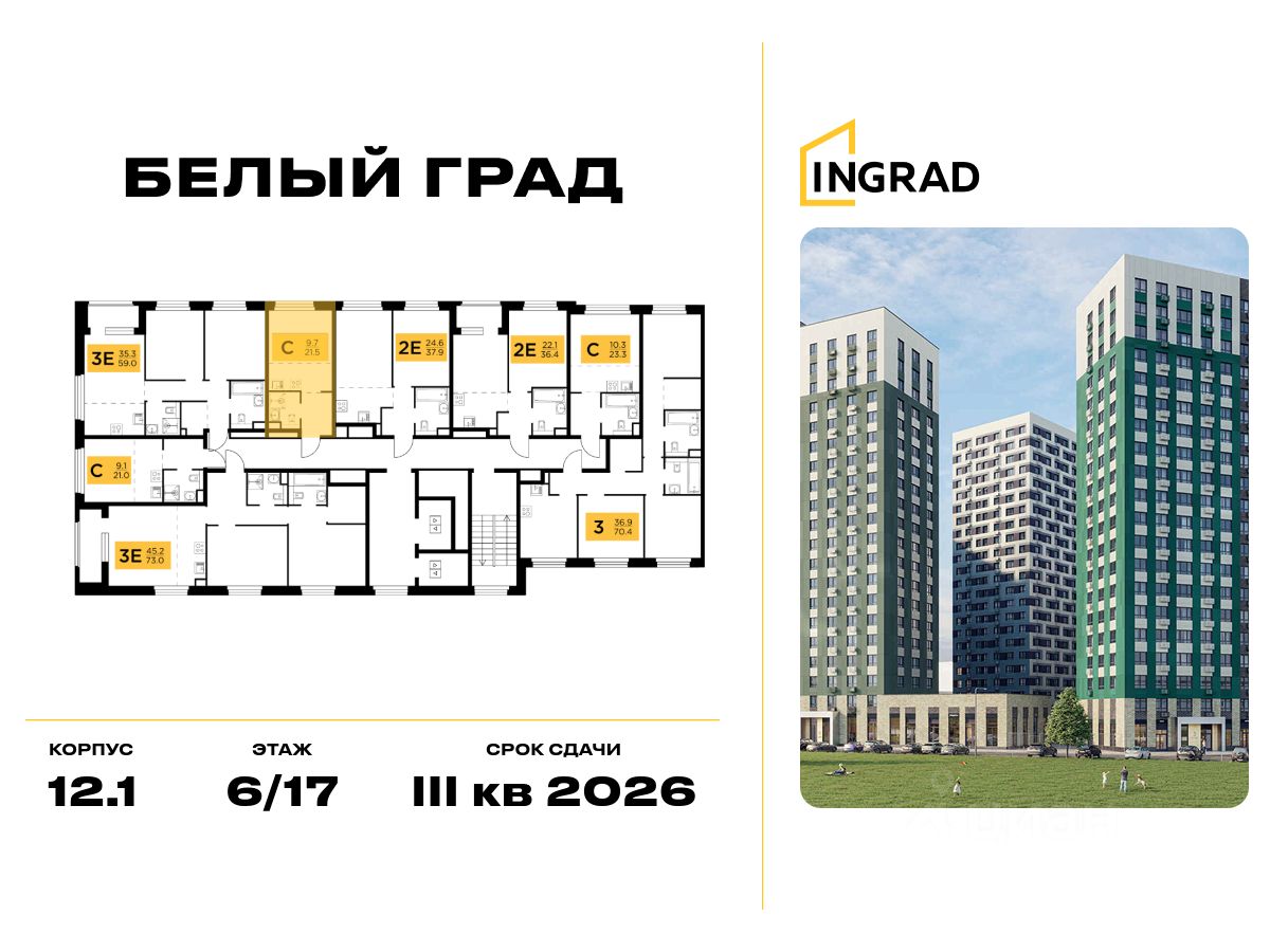 Пряма продажа от застройщика. В жилом квартале комфорт-класса "Белый Град" (застройщик ГК Инград) продаётся студия площадью 21.50 кв.м без отделки. Квартира расположена на 9 этаже 17-этажного дома, корпус 12.1.