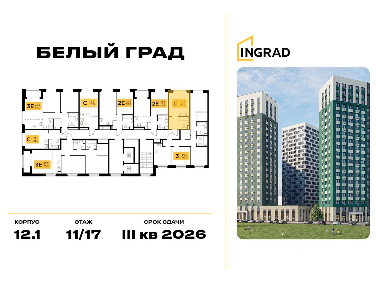 Пряма продажа от застройщика. В жилом квартале комфорт-класса "Белый Град" (застройщик ГК Инград) продаётся студия площадью 23.30 кв.м без отделки. Квартира расположена на 11 этаже 17-этажного дома, корпус 12.1.