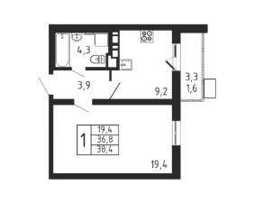 Продаётся 1-комнатная квартира в строящемся доме (Корпус 4), срок сдачи: II-кв. 2026, общей площадью 38.4 кв.м., на 9 этаже.