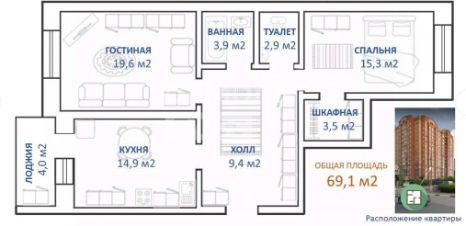 - большую кухню (15 кв.м), соединенную с застекленной лоджией (4кв.м) с панорамными видами.
