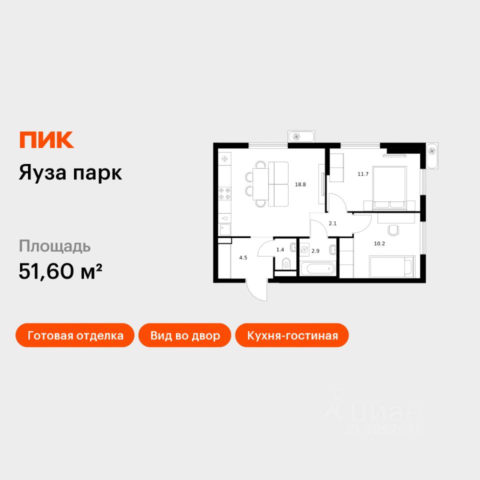 Продаётся 2-комн. квартира площадью 51,6 кв.м на 23 этаже 25 этажного дома (Корпус 11, Секция 1) проекта ПИК Яуза парк. Светлый просторный подъезд на уровне земли, функциональная планировка, большие окна, c отделкой.