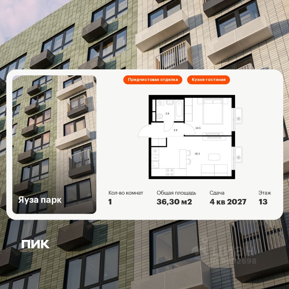 Продаётся 1-комн. квартира площадью 36,3 кв.м на 13 этаже 24 этажного дома (Корпус 12, Секция 1) проекта ПИК Яуза парк. Светлый просторный подъезд на уровне земли, функциональная планировка, большие окна, предчистовая отделка.