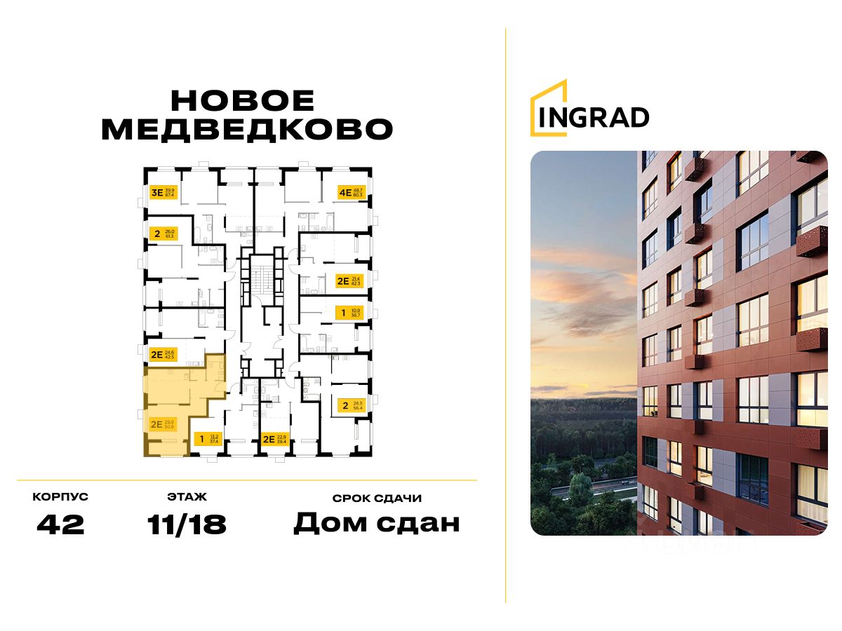 Прямая продажа от девелопера. В жилом квартале, расположенном в северо-западной части города Мытищи, продаётся 1-спальная квартира площадью 48.50 кв.м без отделки. Квартира расположена на 11 этаже 18-этажного дома, корпус 42, в жилом квартале комфорт-класса "Новое Медведково" (девелопер Ingrad).