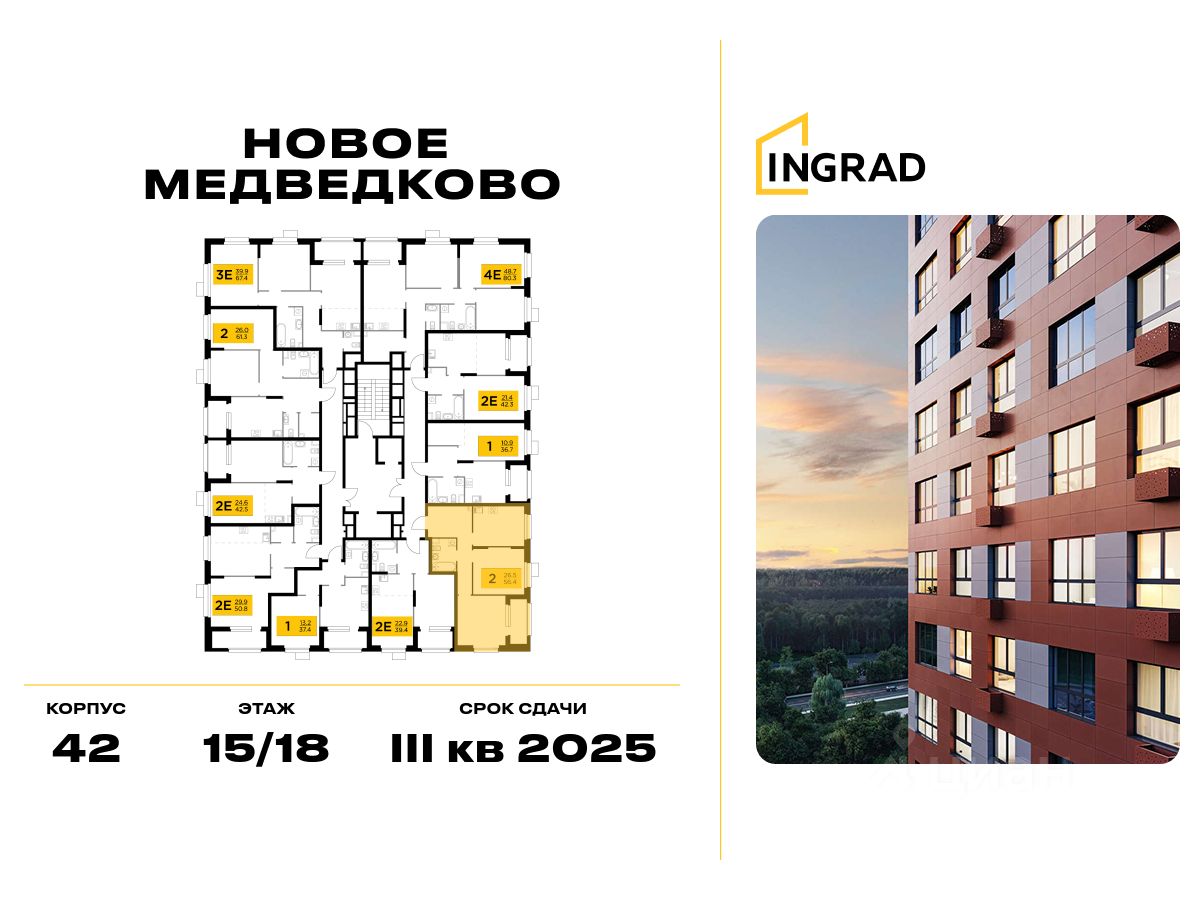 Прямая продажа от застройщика. В жилом квартале, расположенном в северо-западной части города Мытищи, продаётся 2-спальная квартира площадью 54.70 кв.м без отделки. Квартира расположена на 15 этаже 18-этажного дома, корпус 42, в жилом квартале комфорт-класса Новое Медведково (застройщик ГК Инград).