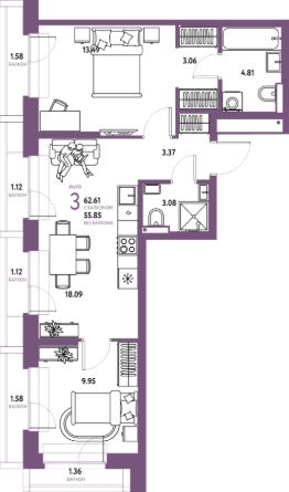 Продаётся 3-комнатная квартира в строящемся доме (Дом Перов), срок сдачи: III-кв. 2026, общей площадью 62.61 кв.м., на 13 этаже. Многоэтажные жилые дома с объектами инфраструктуры, расположенные по адресу: Московская область, г.о. Мытищи, г.Мытищи, мкр. 18Б, ул. Комарова.