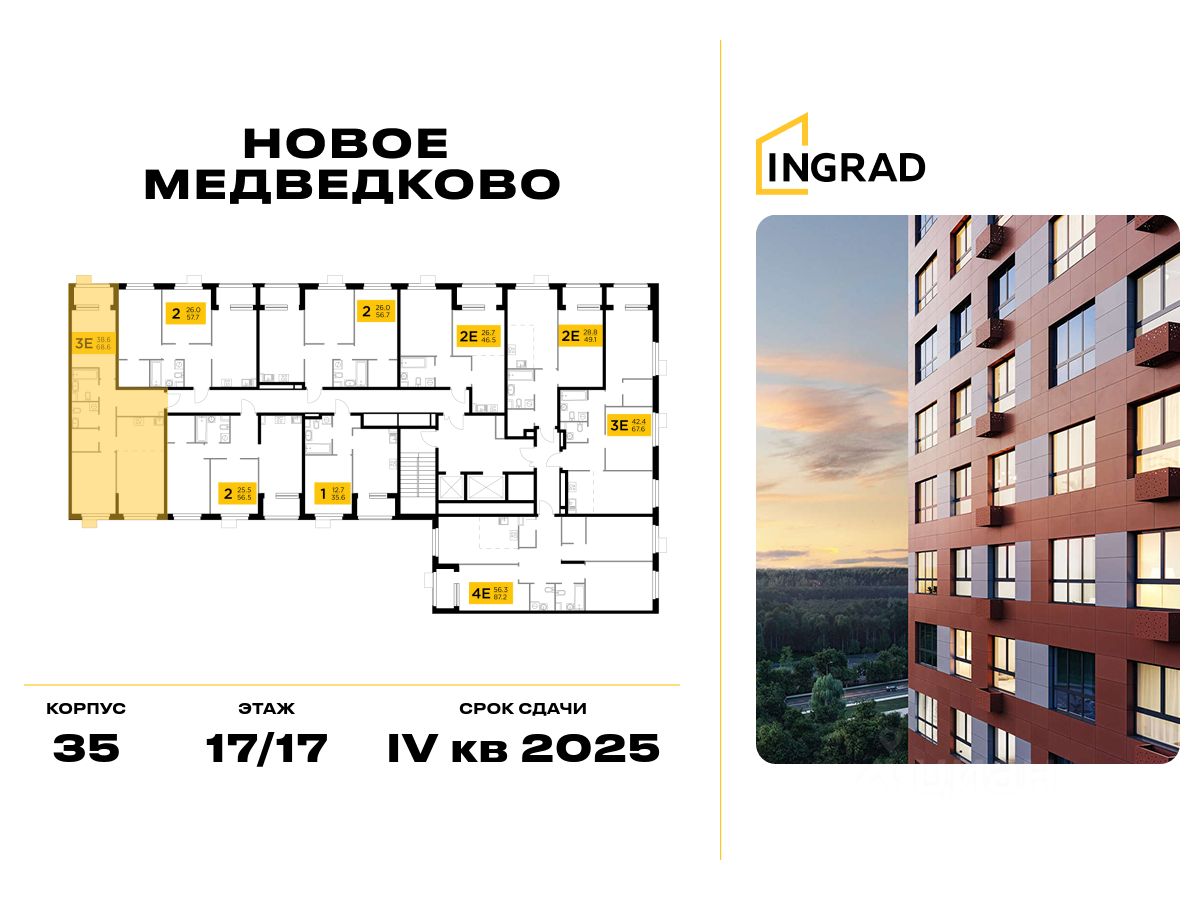 Прямая продажа от застройщика. В жилом квартале, расположенном в северо-западной части города Мытищи, продаётся 2-спальная квартира площадью 67.20 кв.м без отделки. Квартира расположена на 17 этаже 17-этажного дома, корпус 35, в жилом квартале комфорт-класса Новое Медведково (застройщик ГК Инград).