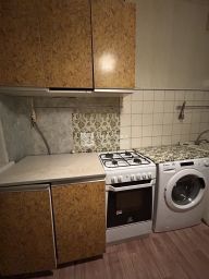 Кухня имеет размеры 2 метра 45 см на 3 метра 15 см. Всего почти 8 метров квадратных. В кухне газовая плита, стиральная машина Канди, холодильник. Все остается новым владельцам.