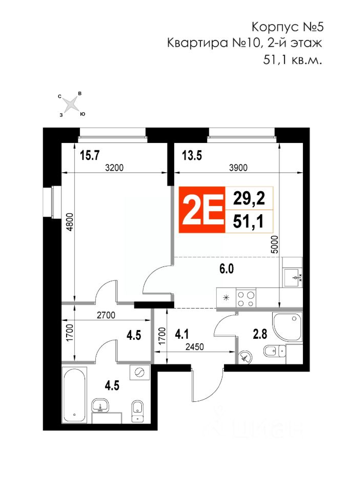 Продаётся 2-комнатная квартира в строящемся доме (Корпус 5), срок сдачи: II-кв. 2026, общей площадью 51.1 кв.м., на 2 этаже. Многоквартирный жилой дом со встроенно-пристроенными нежилыми помещениями и автостоянкой