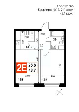 2-комн. квартира, 43,7 м²