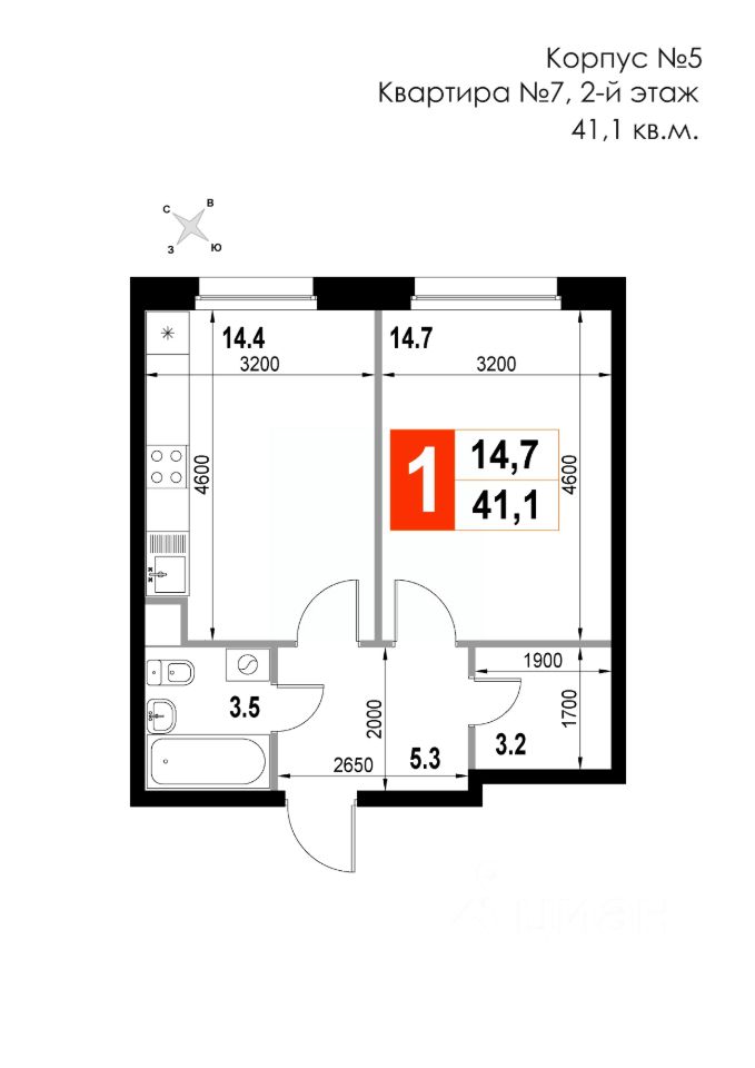 Продаётся 1-комнатная квартира в строящемся доме (Корпус 5), срок сдачи: II-кв. 2026, общей площадью 41.1 кв.м., на 2 этаже. Многоквартирный жилой дом со встроенно-пристроенными нежилыми помещениями и автостоянкой