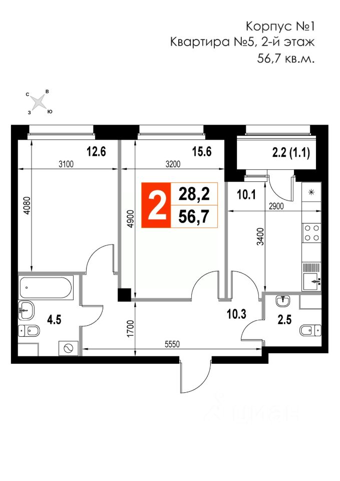Продаётся 2-комнатная квартира в строящемся доме (Корпус 1), срок сдачи: IV-кв. 2025, общей площадью 56.7 кв.м., на 2 этаже. Многоквартирный жилой дом со встроенно-пристроенными нежилыми помещениями и автостоянкой