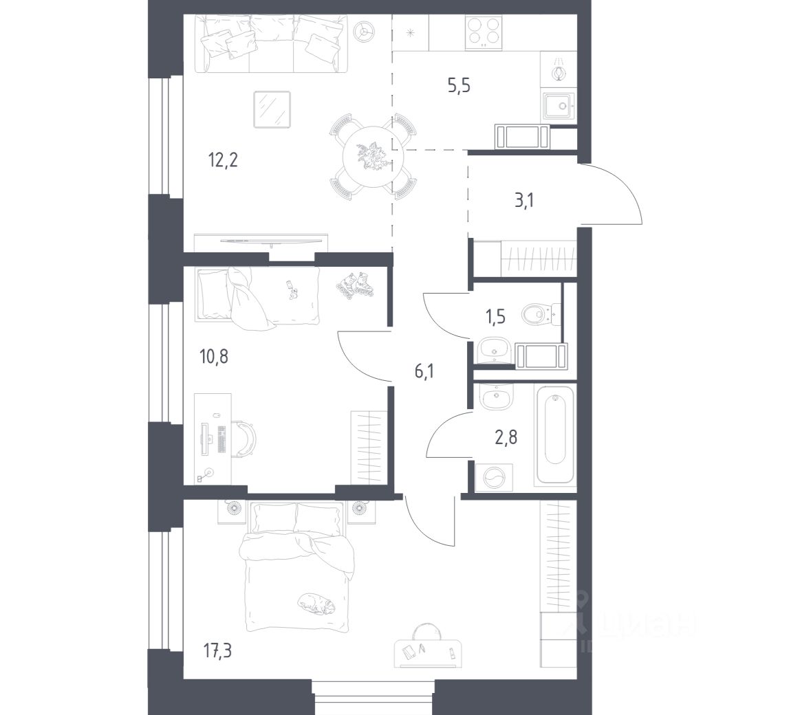 Квартиры комплекса — на выбор: могут быть как с отделкой, так и без. В случае с готовой отделкой уложат напольное покрытие, выровняют стены и поклеят обои в нейтральных тонах, установят потолки, выполнят разводку коммуникаций и подключат сантехнику. Вам также не придётся после заселения менять окна, межкомнатные и входные двери — их качество будет на высоте.