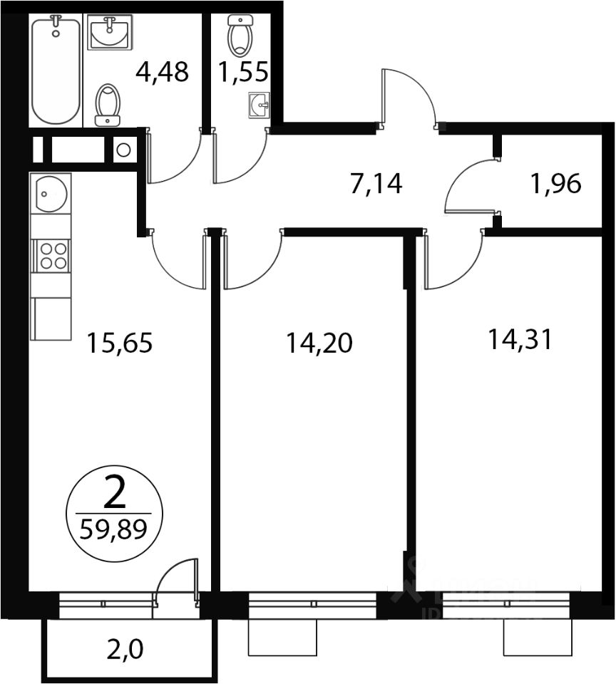 Продаётся 2-комнатная квартира в строящемся доме (Корпус 4), срок сдачи: IV-кв. 2026, общей площадью 59.89 кв.м., на 4 этаже. Расположение, транспортная доступность