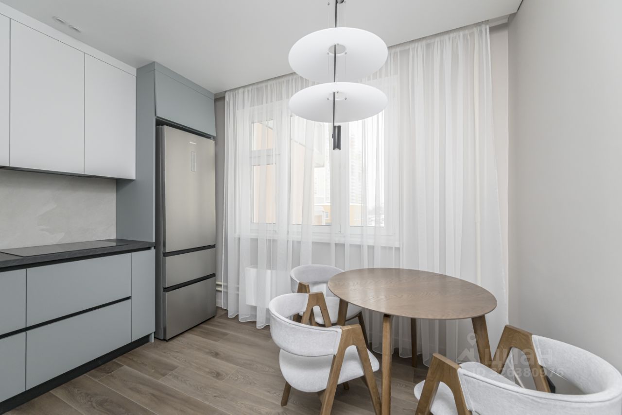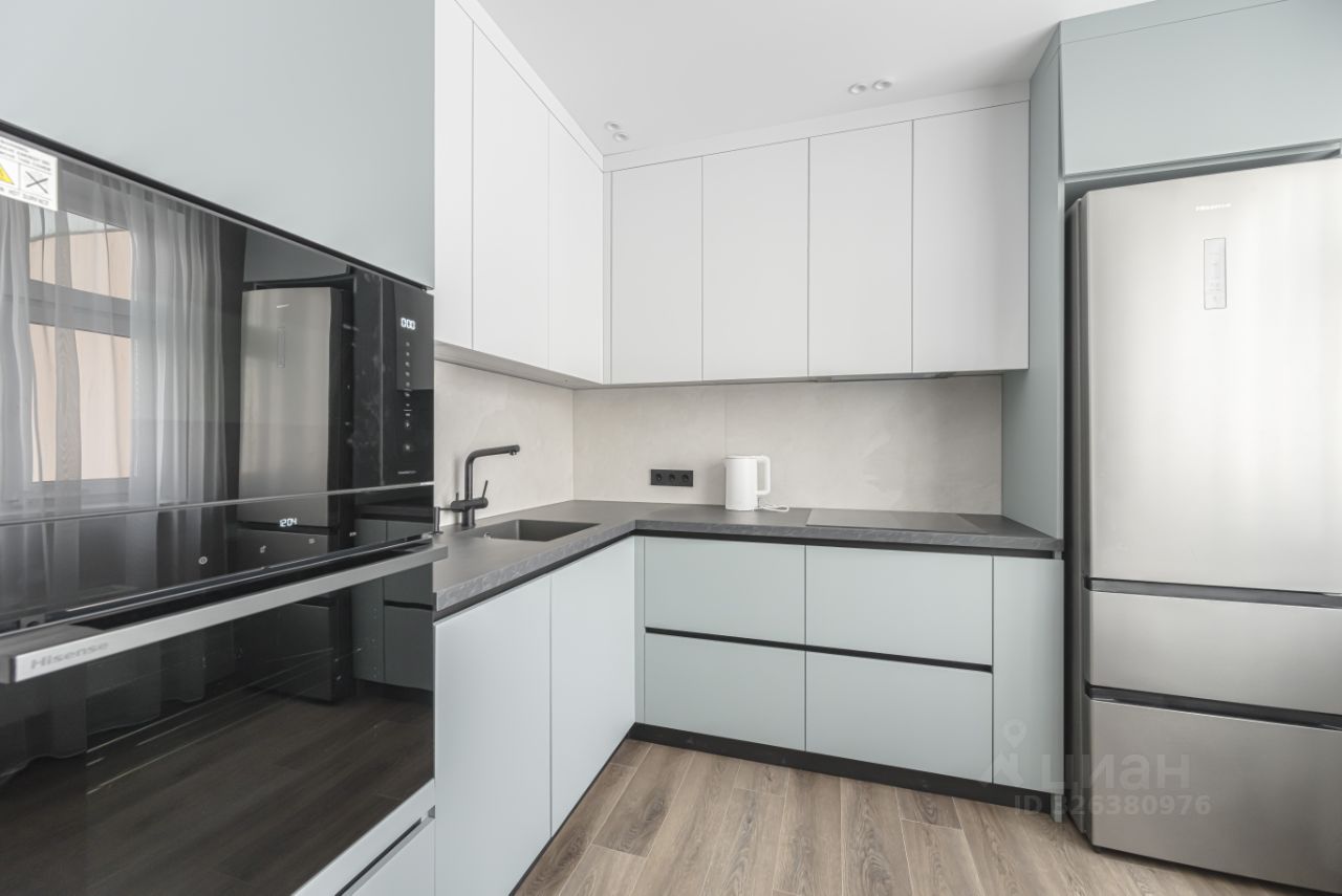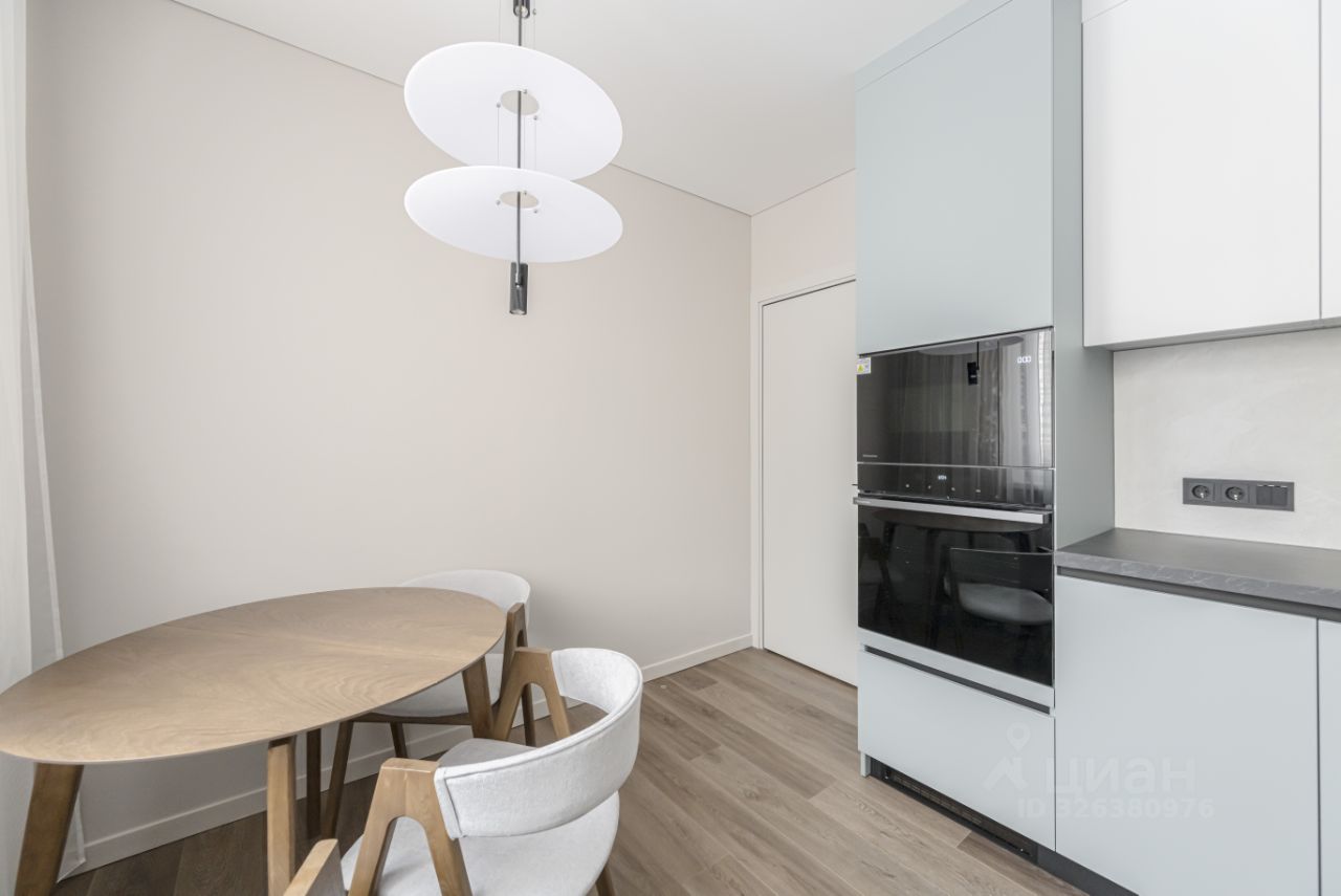 Кухня и встроенные шкафы в комнатах выполнены на заказ из дорогих и долговечных материалов. Кухонный стол и стулья выполнены на заказ из дуба. Вся бытовая техника в квартире, включая кондиционер - Hisense. Стиральная машинка с функцией сушки.