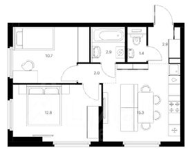 Комнаты 12.8 и 10.7м2, кухня-гостинная 15.3м2. Этаж 2. Вид на тихий огороженный двор. Теплая просторная видовая квартира.