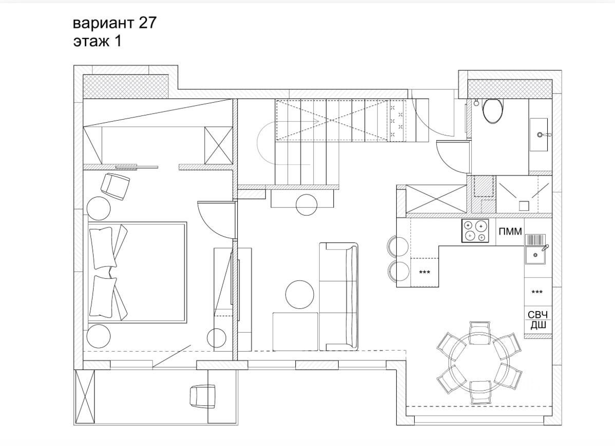 На 1 этаже: прихожая, кухня-гостиная, мастер-спальня с балконом и со своей гардеробной, санузел с душем.
