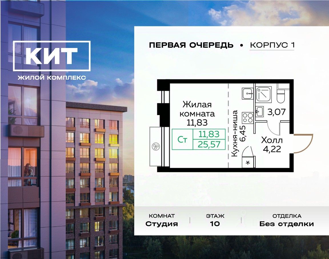 Продаётся студия 25.5 кв.м. без отделки в ЖК "КИТ" на 10-м этаже 25 этажного дома.