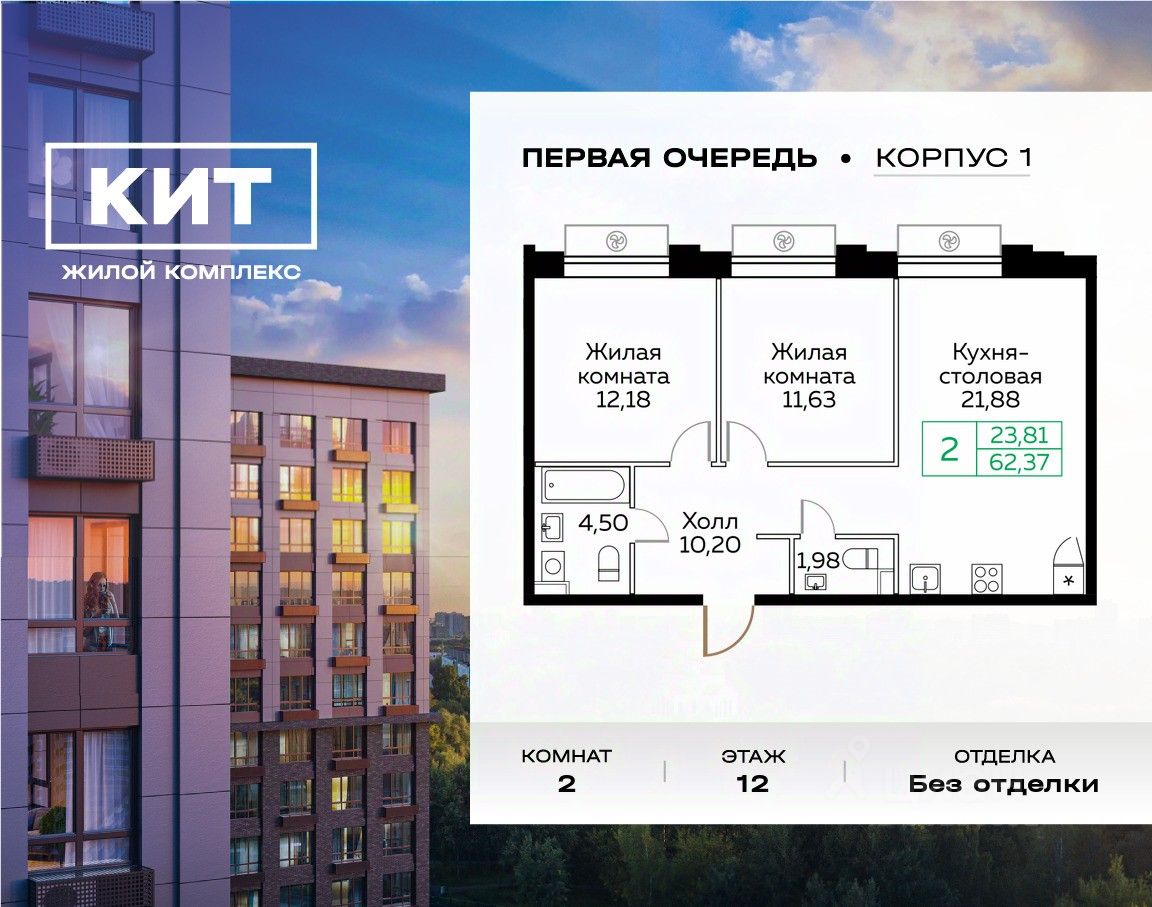 Продаётся 2-к квартира 62.3 кв.м. без отделки в ЖК "КИТ" на 12-м этаже 25 этажного дома.