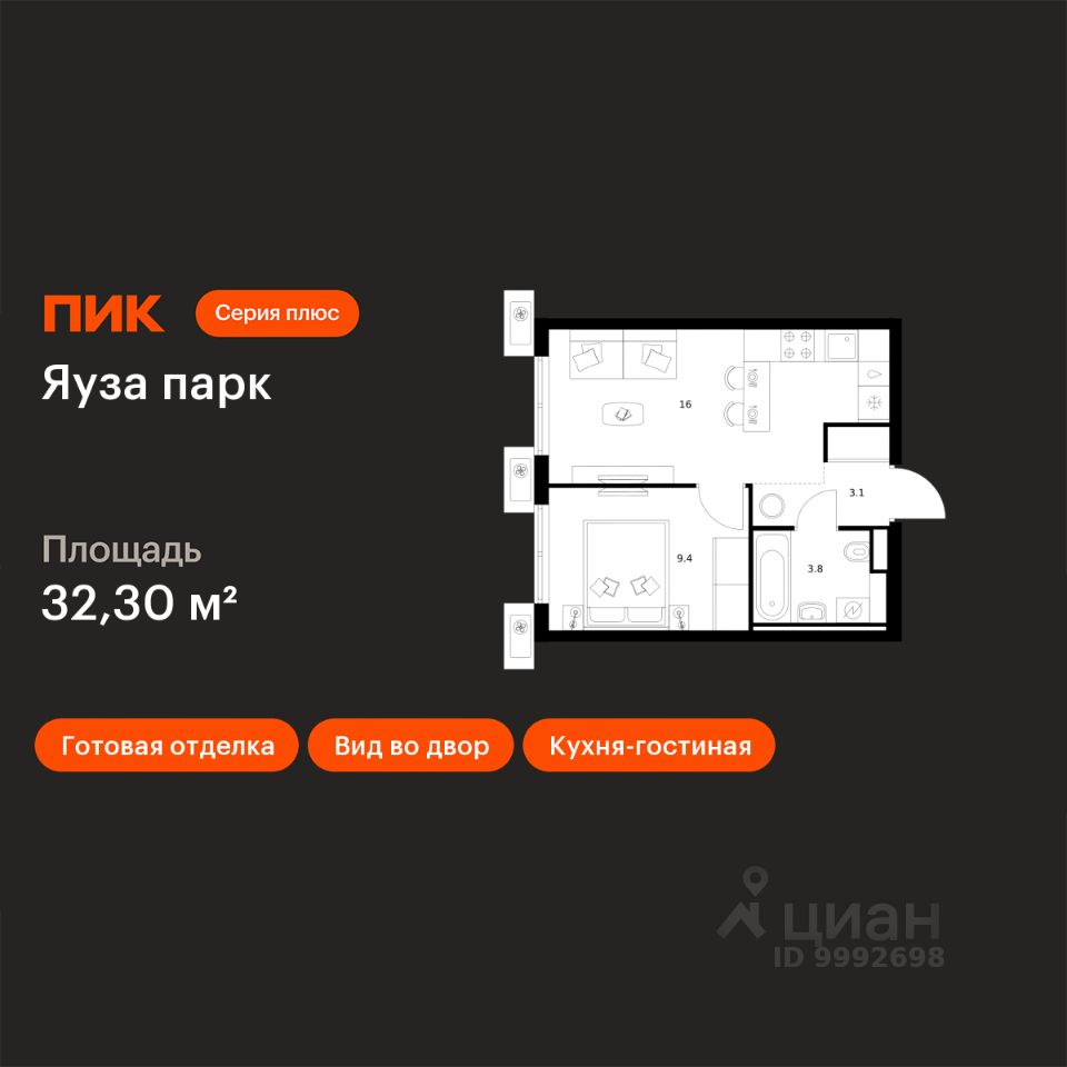 Продаётся 1-комн. квартира площадью 32,3 кв.м на 24 этаже 24 этажного дома (Корпус 14, Секция 1) проекта ПИК Яуза парк. Светлый просторный подъезд на уровне земли, функциональная планировка, большие окна, c отделкой.